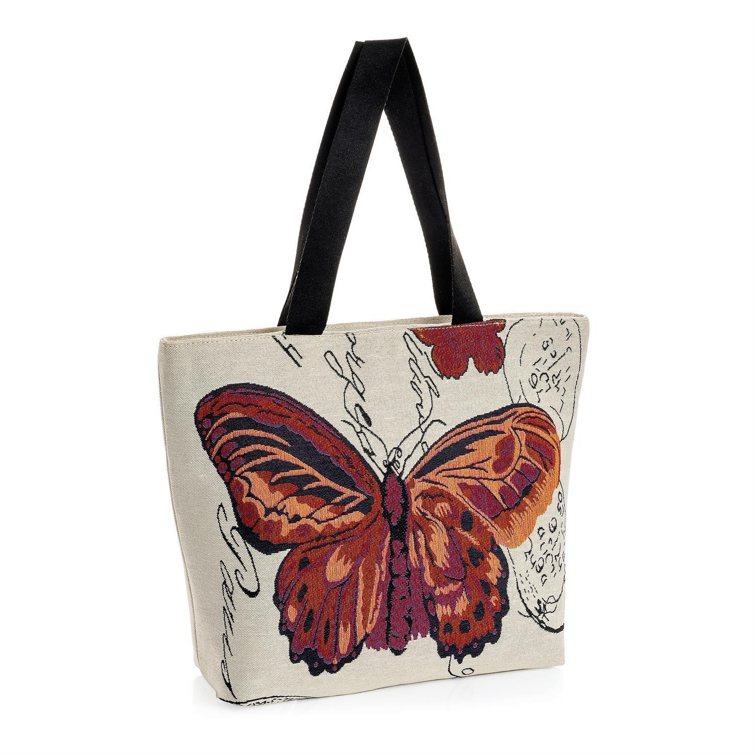Fashionable 47cm x 33cm burgundy and cream tone butterfly design fashion bag with black handle.