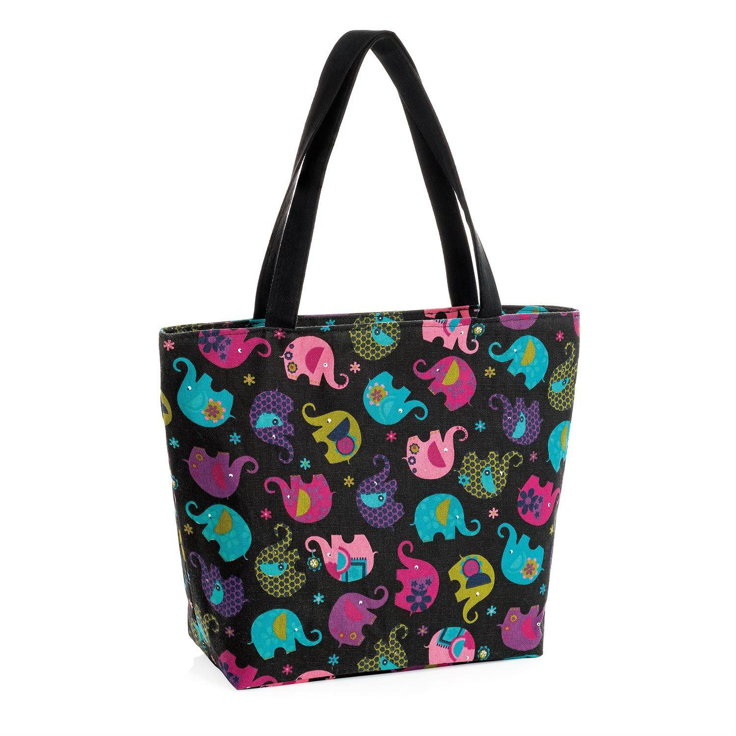 Novelty look 43cm x 33cm black and multi colour elephant print design fashion bag.