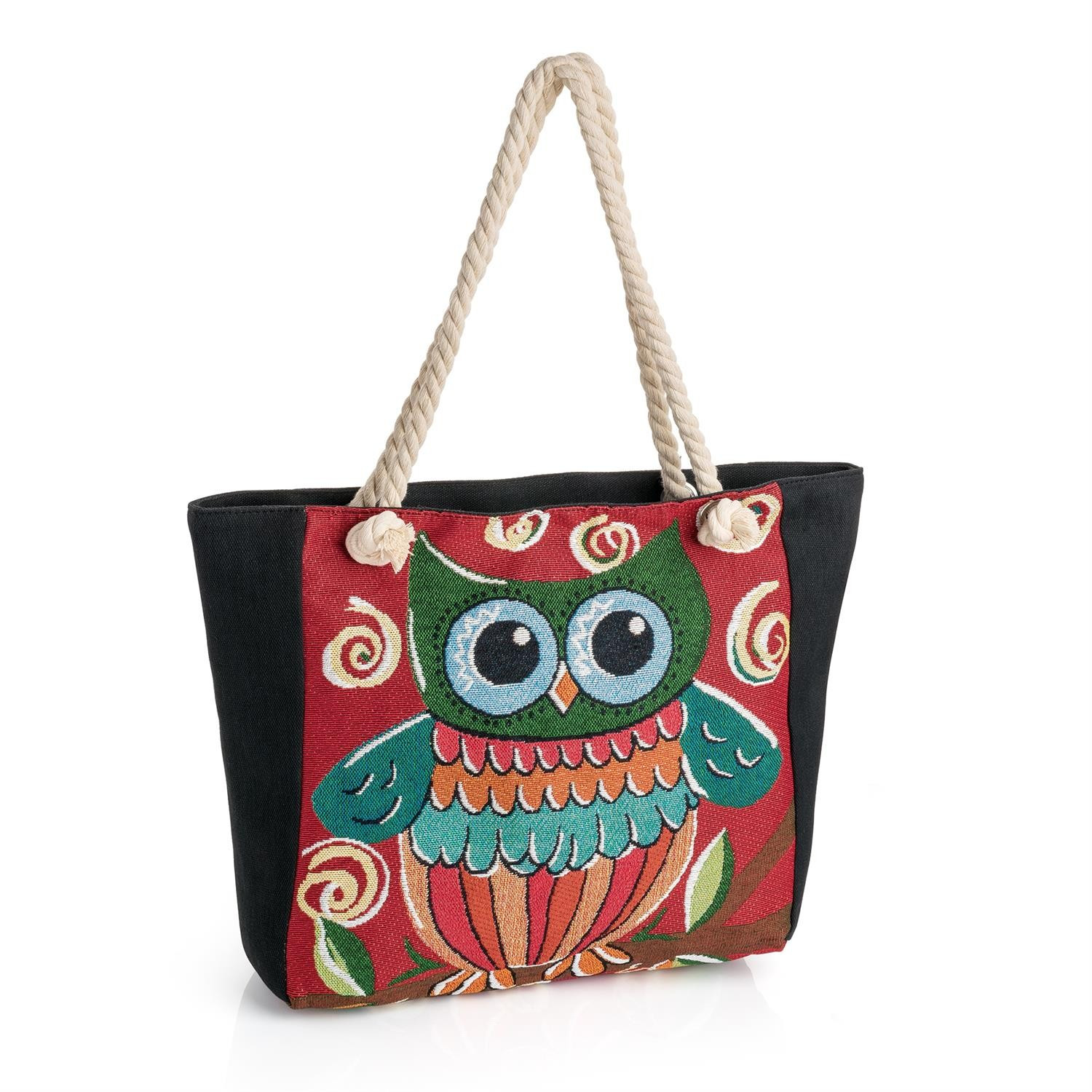 Fashionable 45cm x 32cm black and red tone owl print bag witha rope style handle.