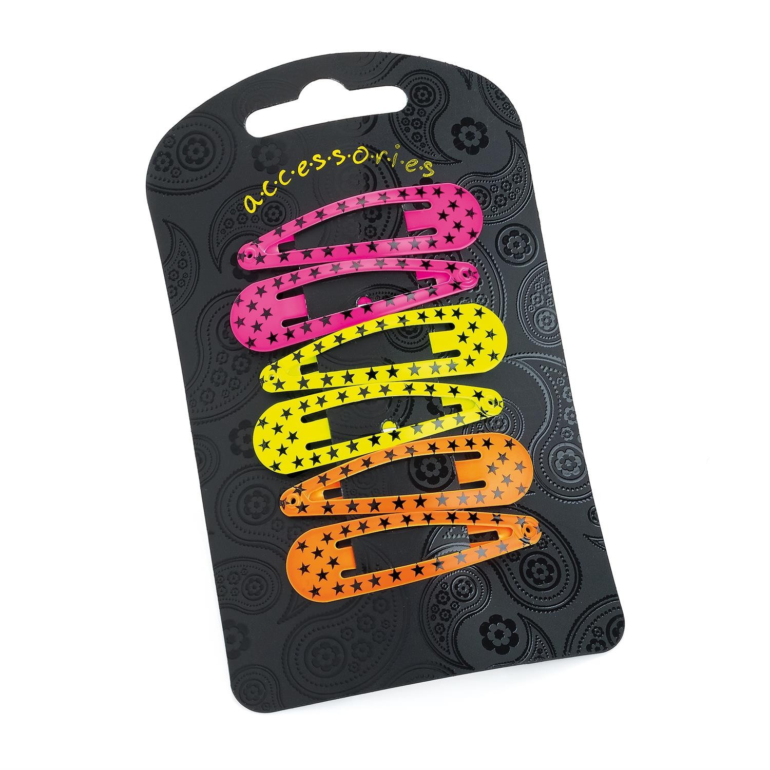 Stylish six piece 5cm wide star print design hair snap clip set in neon pink, yellow and orange colours.