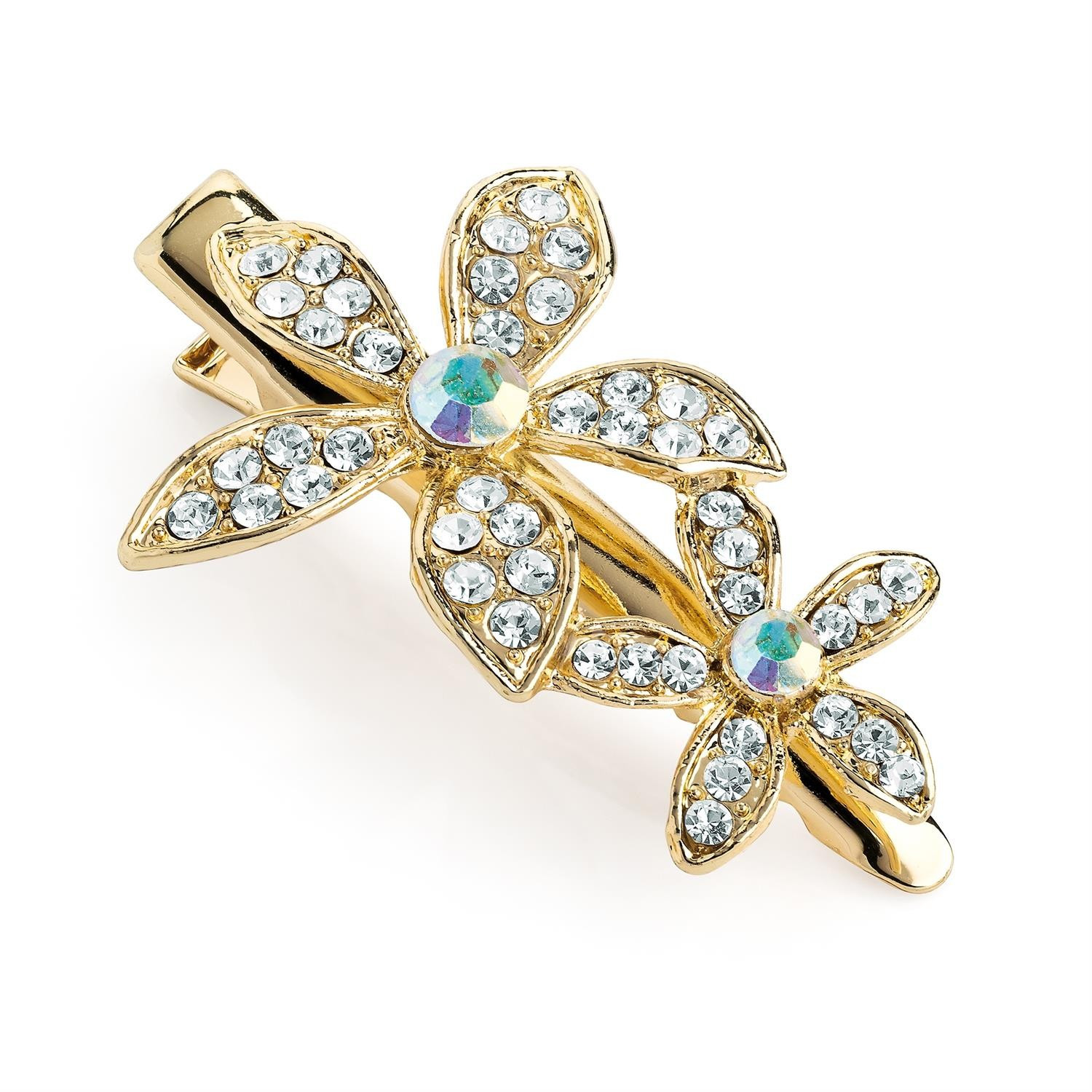 Elegant 4.5cm wide shiny gold colour flower design metal hair clip with crystal and AB crystal stones. Also available in a silver colour.