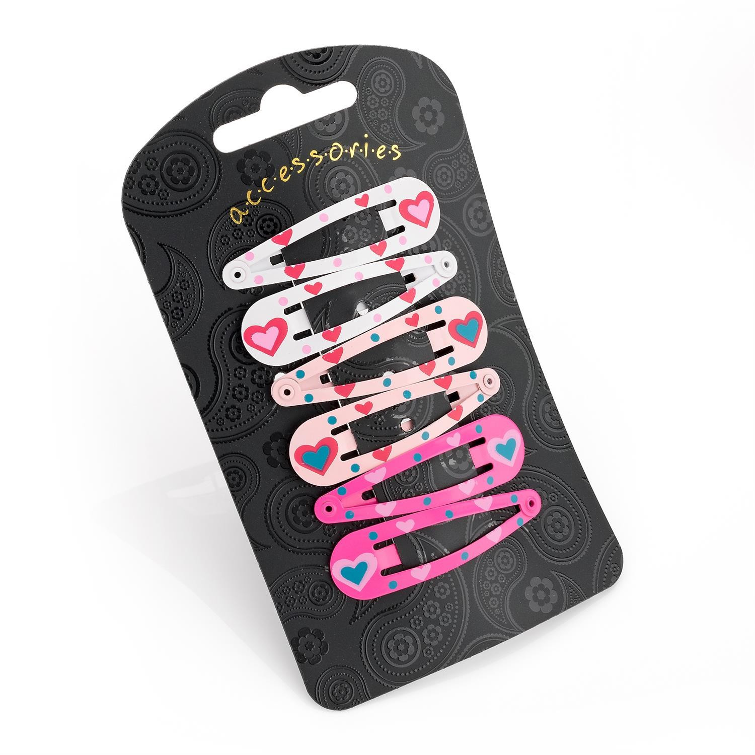 Trendy six piece 5cm wide heart design hair snap clip set, two pieces in white, two pieces in light pink and two pieces in pink.