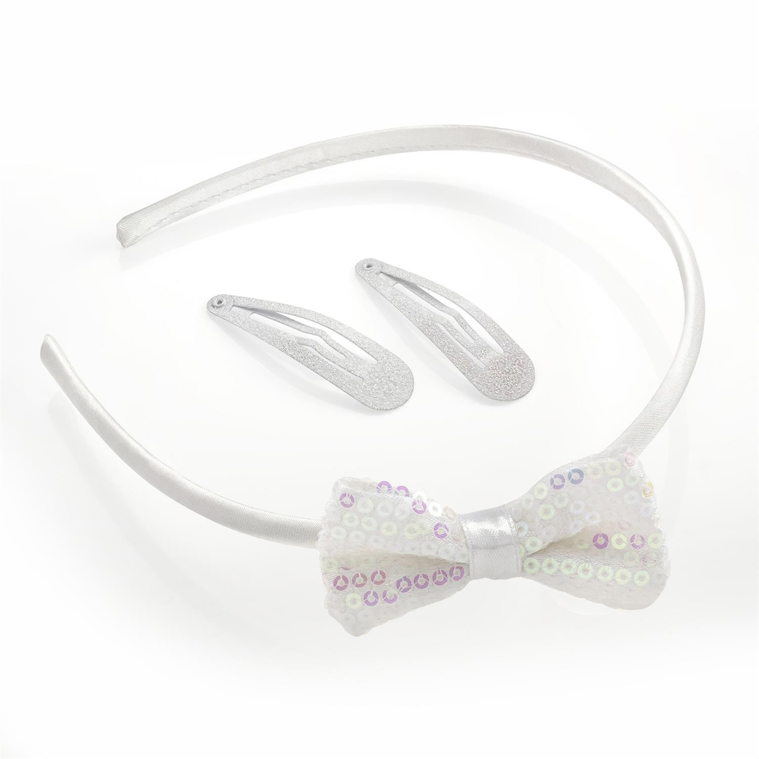Popular three piece girly hair accessory set, the set contains one 6.5cm wide white sequin bow headband and two 5cm wide white glitter snap clips. Also available in pink.