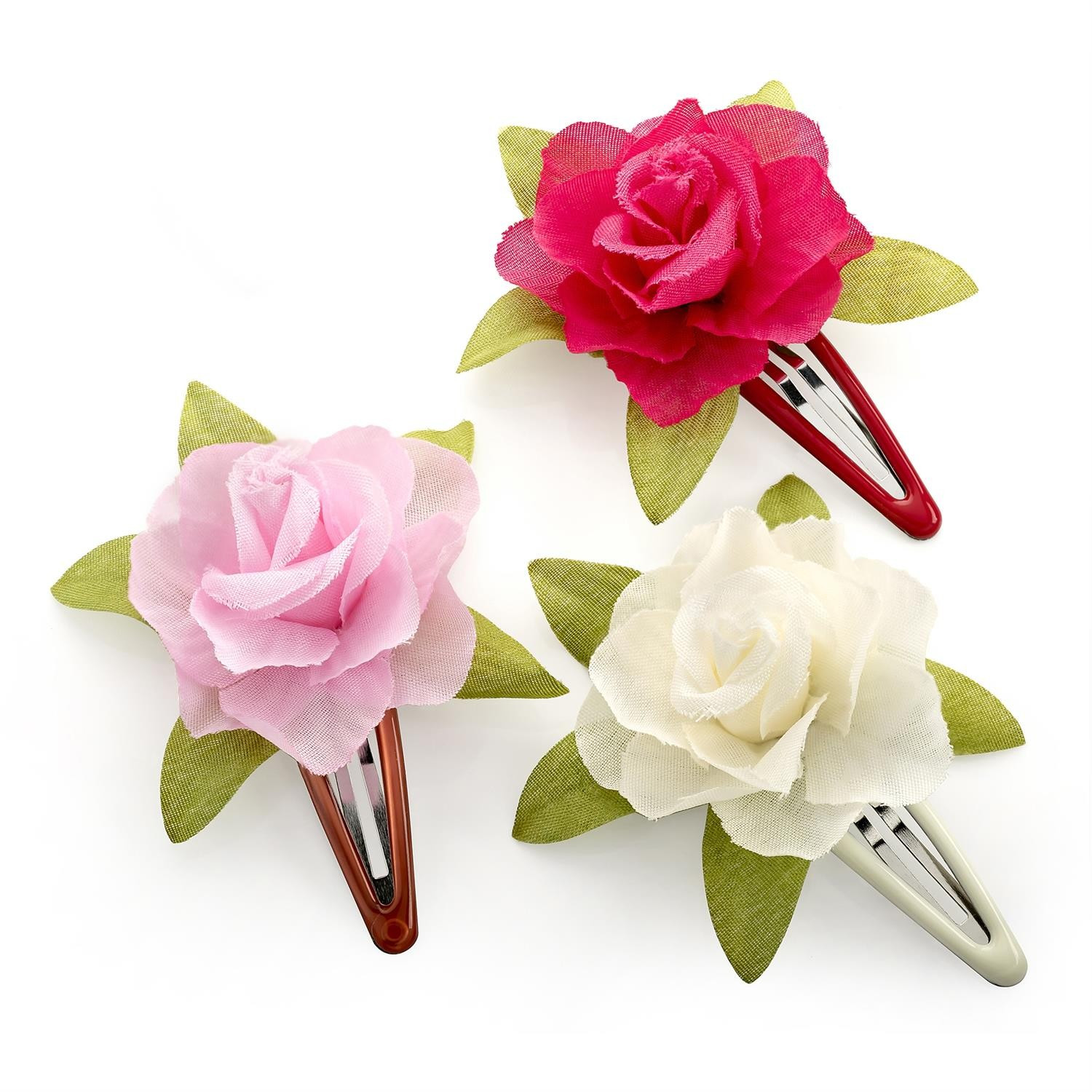 Pretty three piece 4.5cm wide flower design hair snap clip set n fuchsia, pink and cream colours. Part of our fashion hair accessories range.