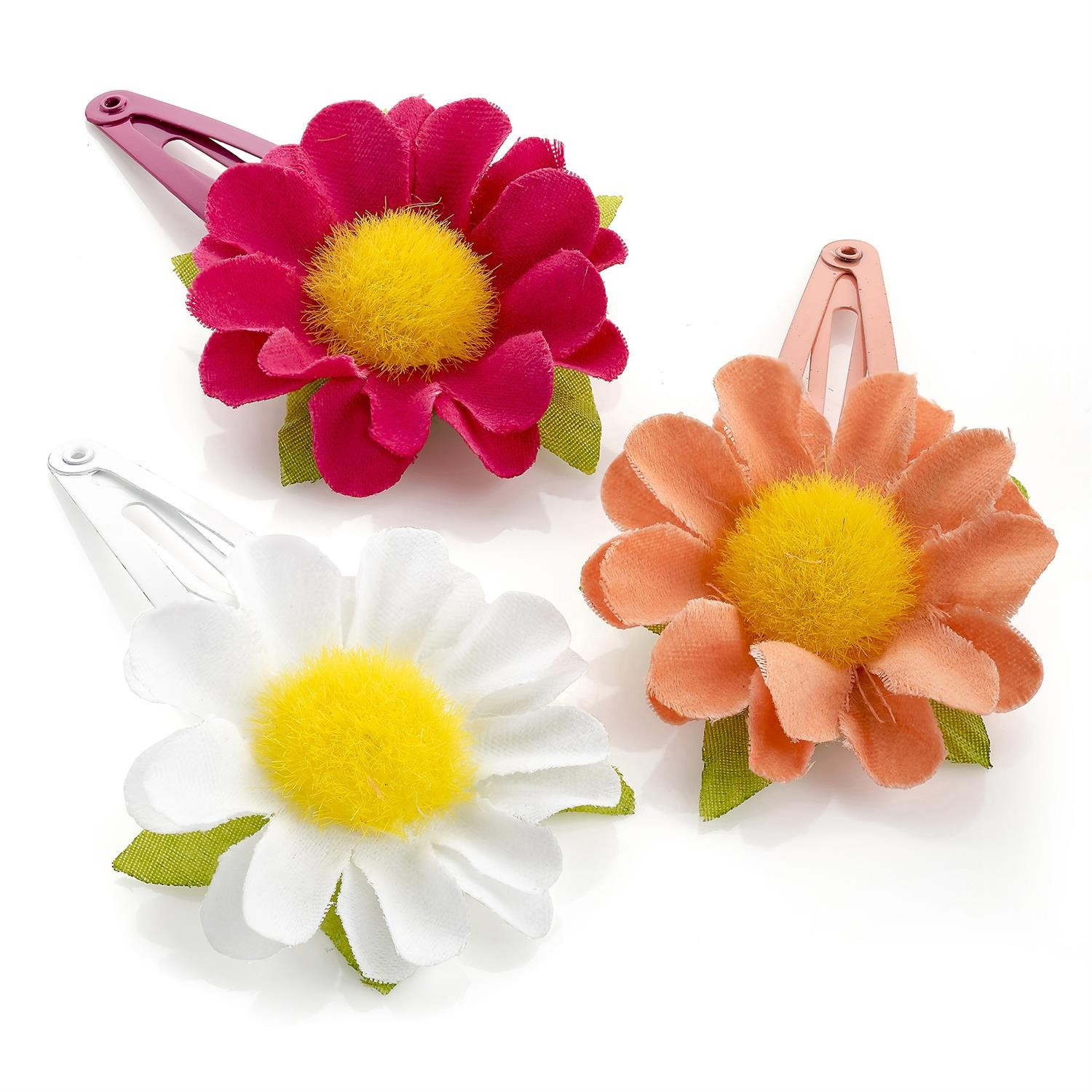 Summery three piece 7cm wide flower design snap clip set in fuchsia, white and peach colours. Part of our fashion hair accessories collection.