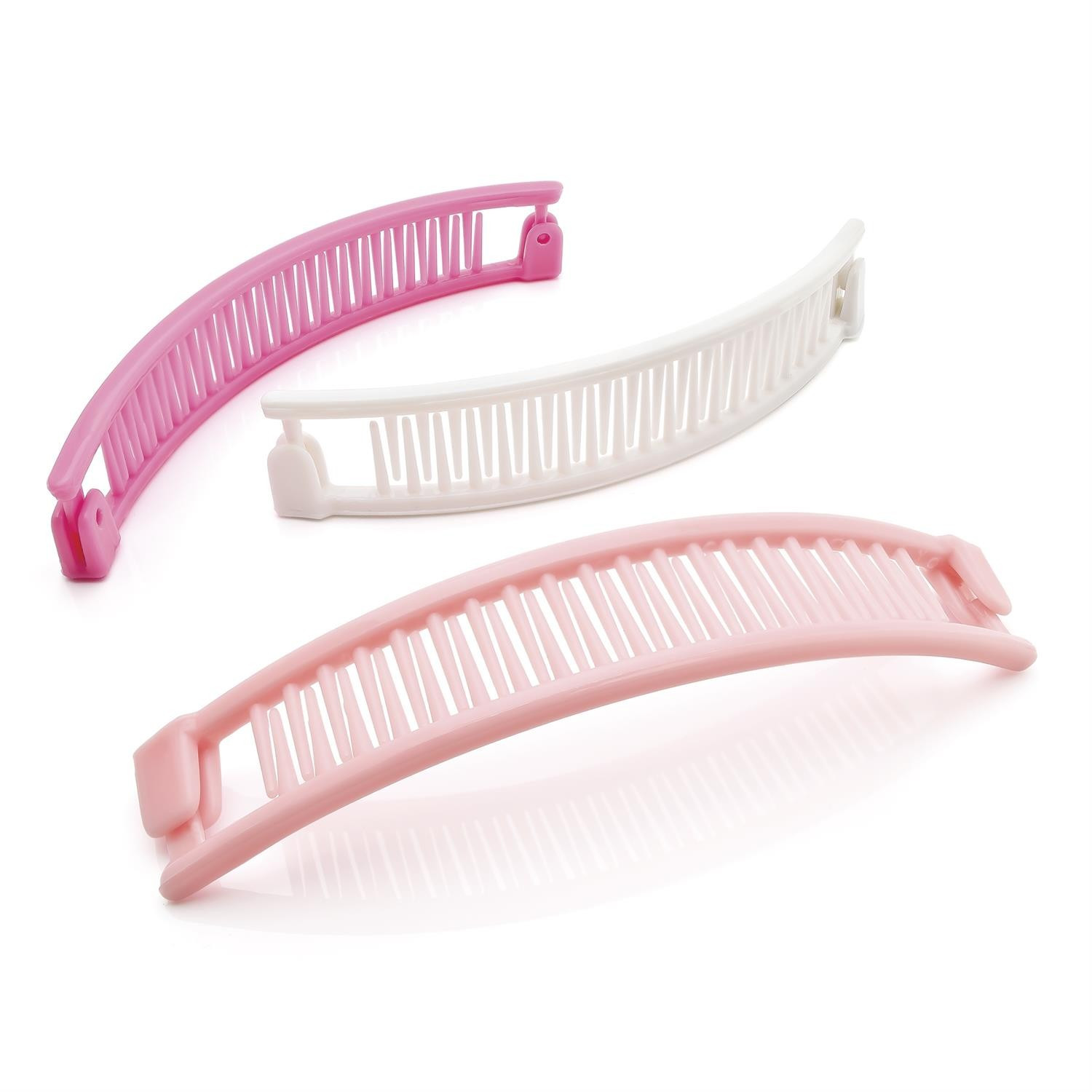 Everyday three piece pastel colour hair banana clip set. One piece is a 13cm white colour plastic hair banana clip. One piece is a pink colour 13cm plastic banana clip. One piece is a peach colour 13cm plastic banana clip.